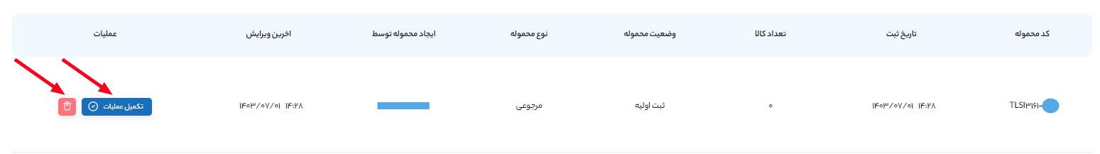 توجه داشته باشید که برای نهایی شدن محموله مرجوعی، حتما باید تکمیل عملیات را انتخاب کنید. همچنین اگر در ساخت محموله، اشتباهی رخ داده، میتوانید محموله ساخته شده را حذف کنید.