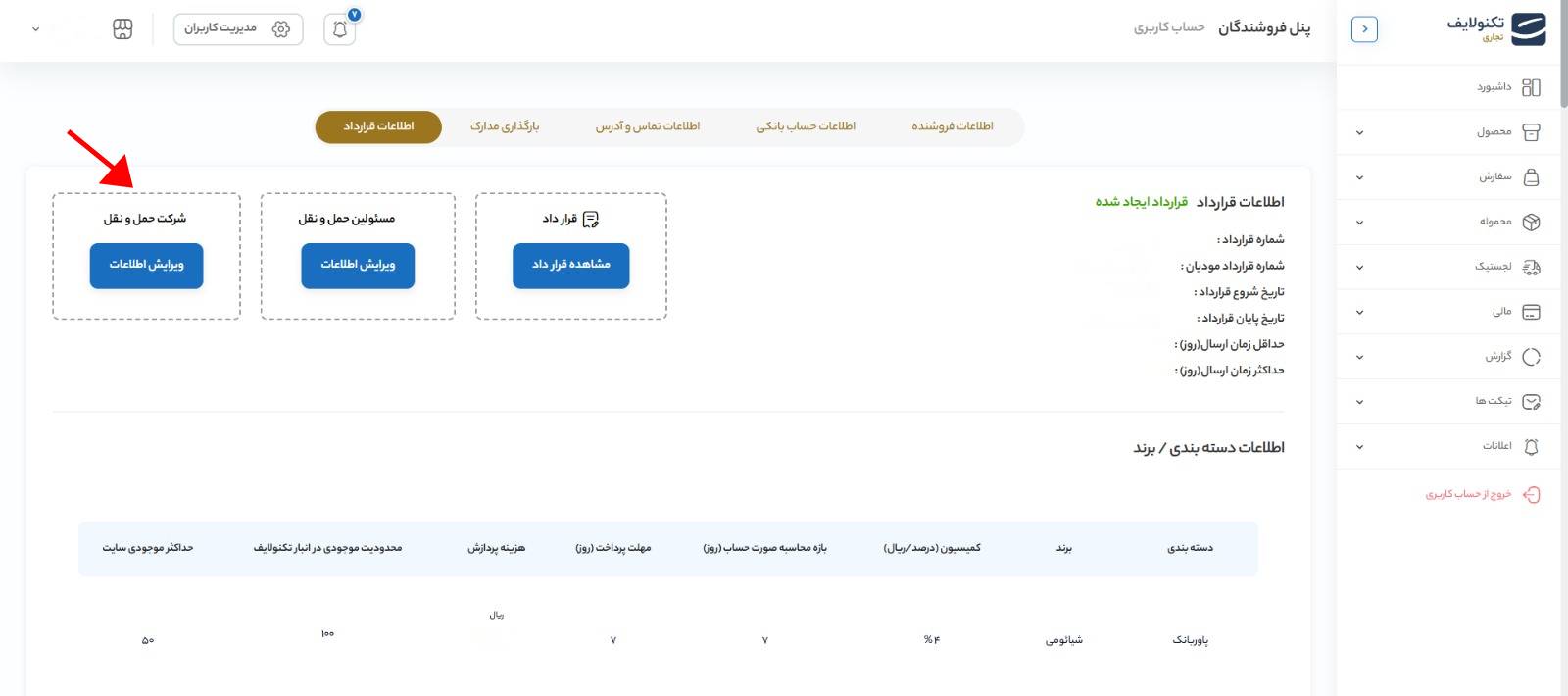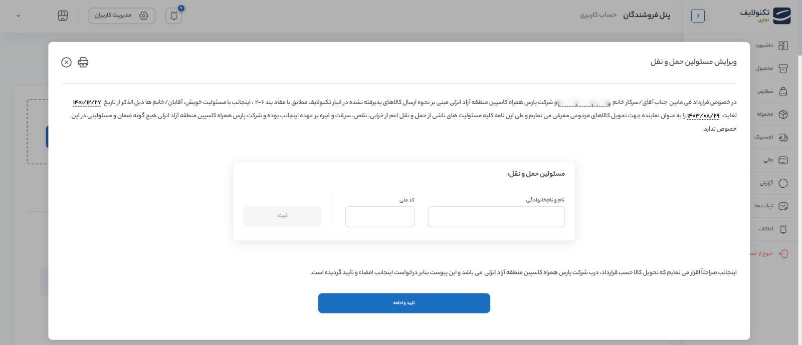 وارد پنل خود شده و در قسمت اطلاعات قرارداد، گزینه شرکت حمل و نقل را انتخاب کنید. در این بخش، اطلاعات شخص تحویلگیرنده شامل نام و کد ملی را وارد نمایید.