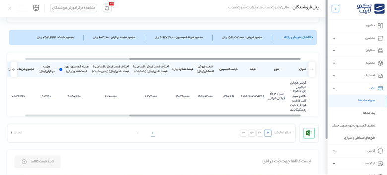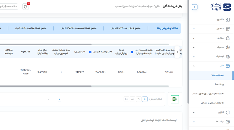 همچنین امکان دریافت خروجی اکسل از این صورتحسابها نیز فراهم شده تا بتوانید تمامی جزئیات ذکر شده را در قالب فایل قابل ذخیره و بررسی در اختیار داشته باشید. با این بهروزرسانی، شفافیت مالی و دقت در محاسبات افزایش یافته و امکان مدیریت و تحلیل بهتر صورتحسابها برای فروشندگان فراهم شده است.