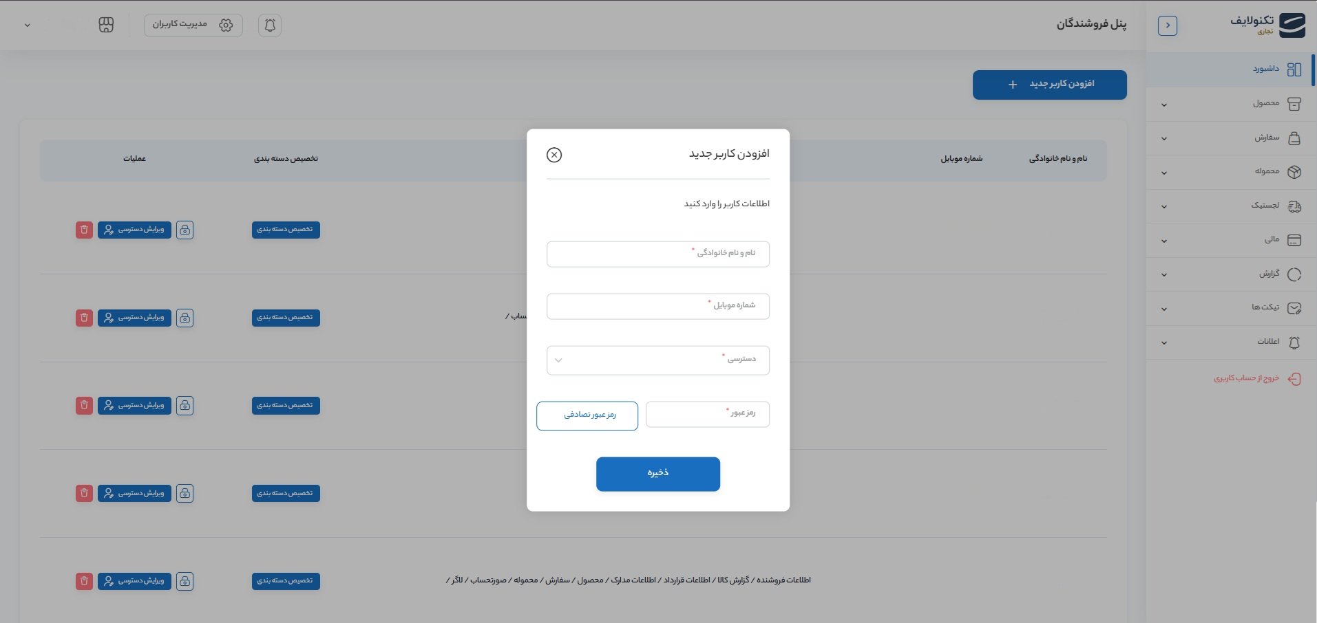 در این بخش می‌توانید اطلاعات کاربر جدید مانند نام و نام‌خانوادگی، شماره موبایل، رمز عبور بنویسید یا رمز عبور تصادفی را انتخاب کنید.